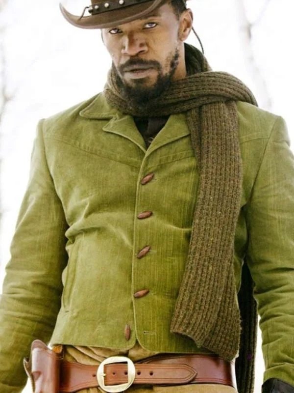 This Jamie Foxx Django Jacket is inspired by the popular movie, Django Unchained. The jacket is made up of green cotton fabric and has a shirt style collar. It also has long sleeves with buttoned cuffs, front pockets, and a buttoned front. This jacket is perfect for all occasions and will make you look stylish and handsome.